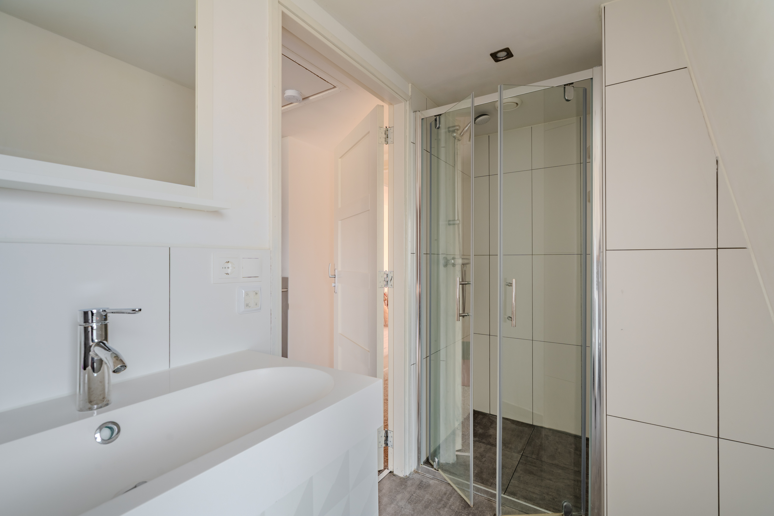 1e verdieping: overloop – slaapkamer(12,1m²) – slaapkamer(8,5m²) – slaapkamer(5,8m²) - badkamer(3,9m²) voorzien van inloopdouche, wastafelmeubel en tweede toilet.