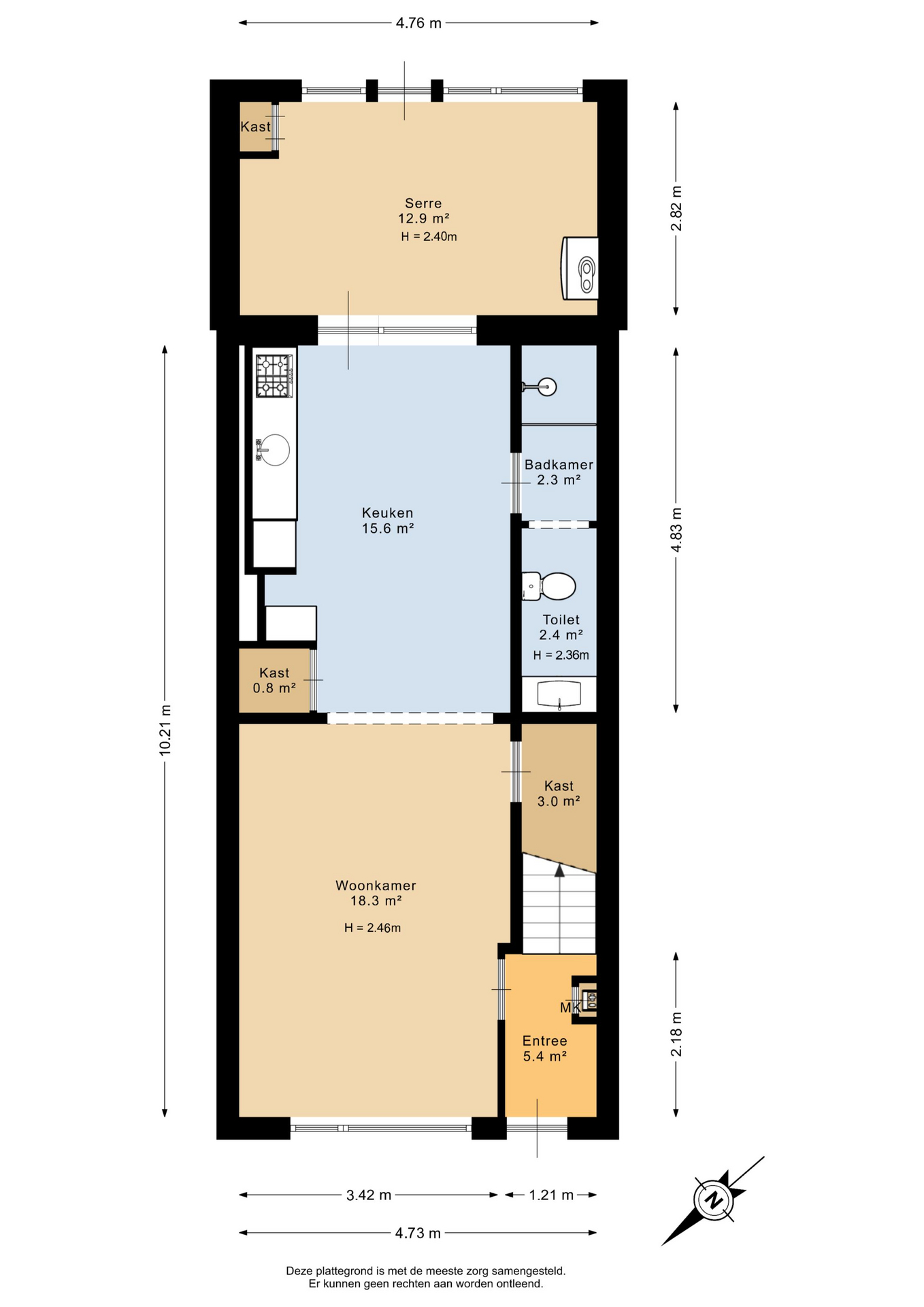 Begane grond: entree/hal met trapopgang - woonkamer(18,3m²) met open keuken(15,6m²) met inbouwkeuken – badkamer(4,7m²) met toilet - serre(12,9m²) met achterom en witgoedaansluiting.