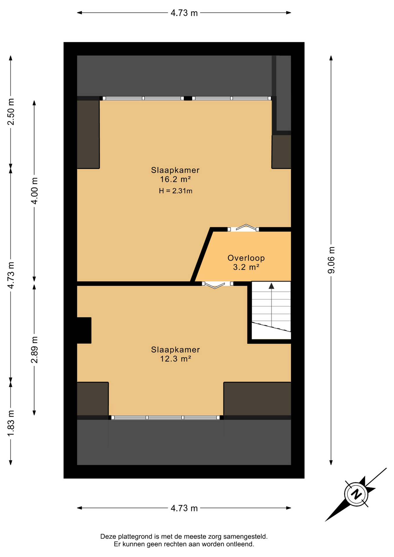 1e verdieping: overloop – slaapkamer(16,2m²) – slaapkamer(12,3m²)
