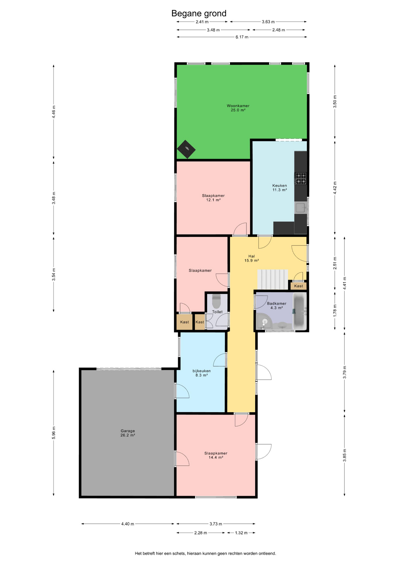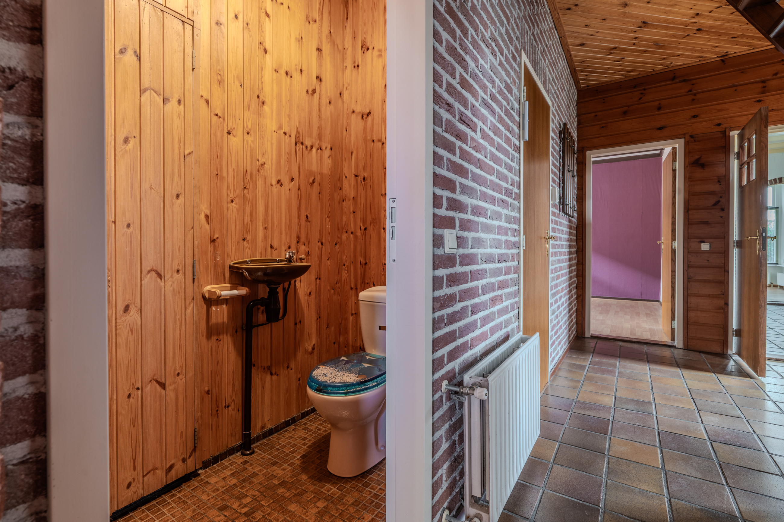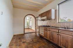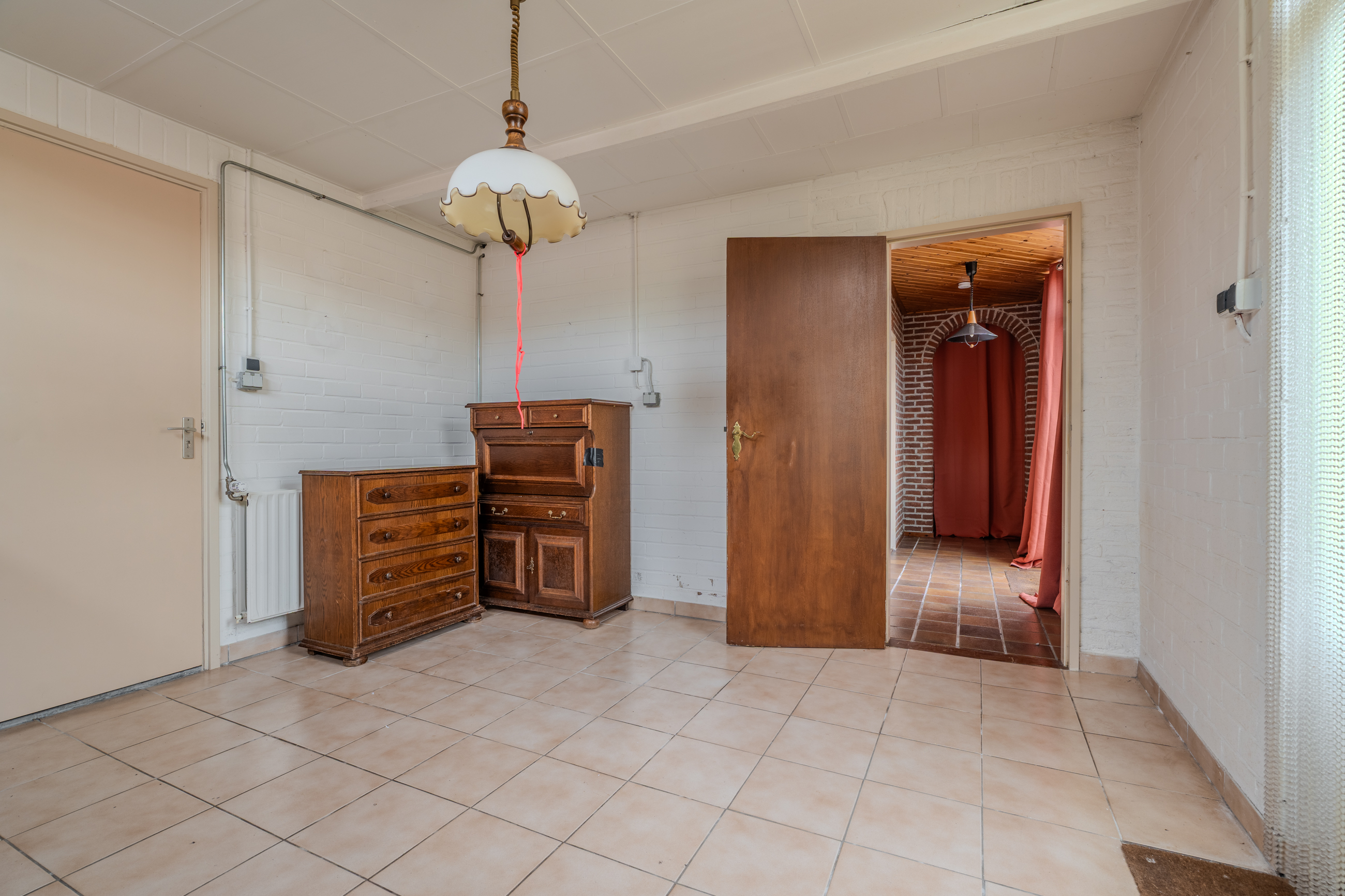 entree/gang met trapopgang en meterkast – keuken (11,3m²)met donkereiken inbouwkeuken - woonkamer(25m²) met schouw – slaapkamer (12,1m²) – slaapkamer – toilet – badkamer voorzien van ligbad, wasmeubel en douche - bijkeuken(8,3m²) met doorgang naar aangebouwde garage(26,2m²) – slaapkamer(14,4m²) met deur naar tuin.