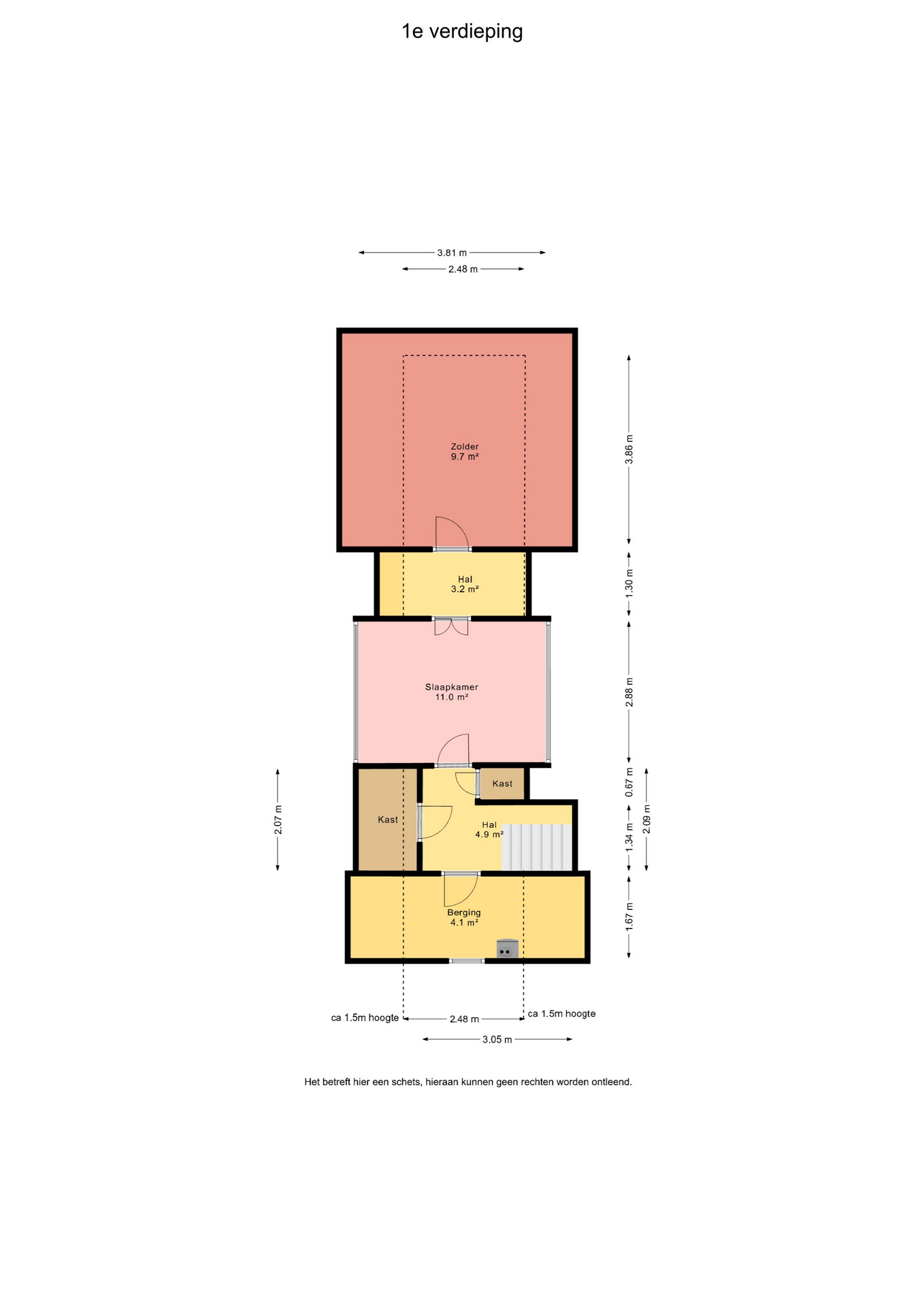 overloop met vaste kasten – slaapkamer(11m²) – berging met cv installatie – zolder.