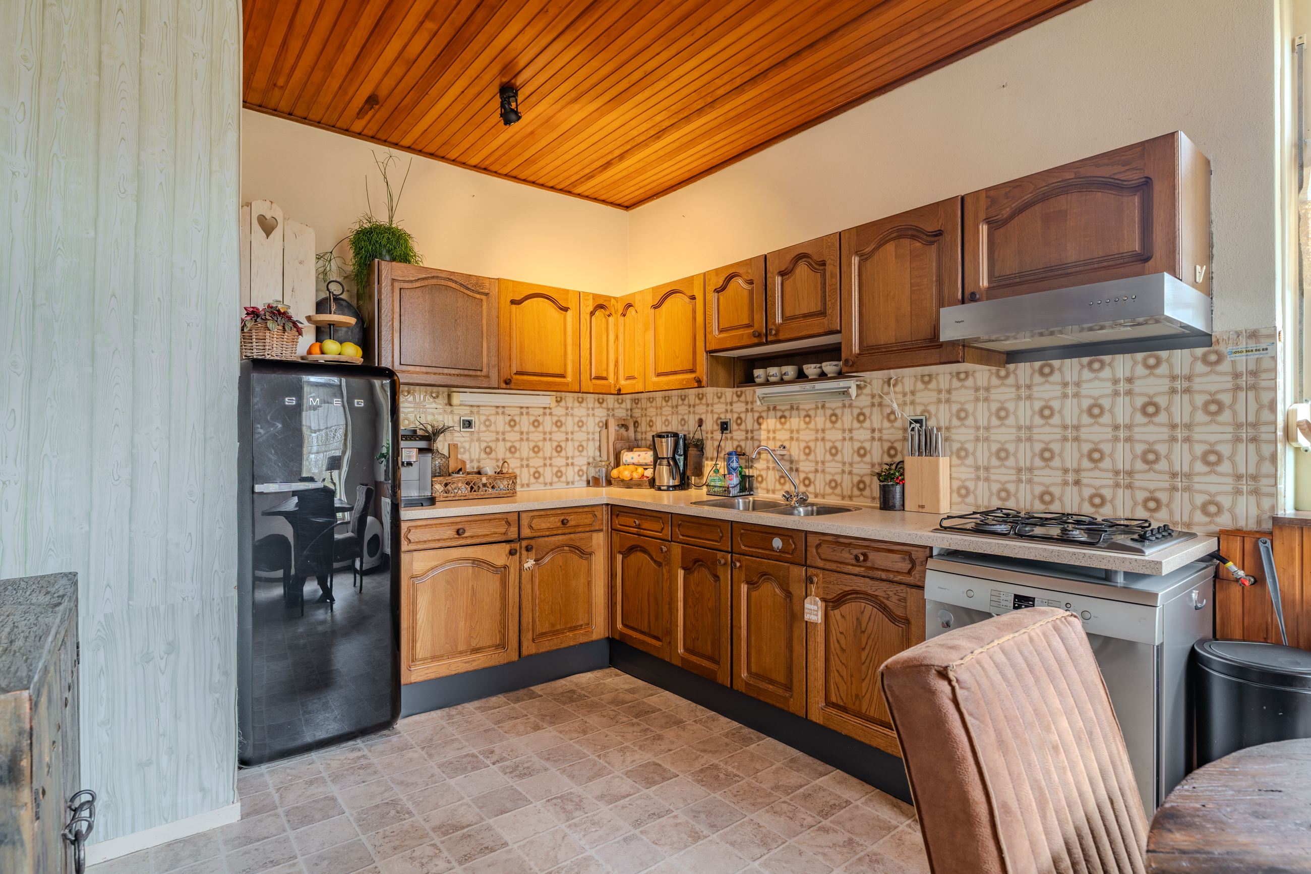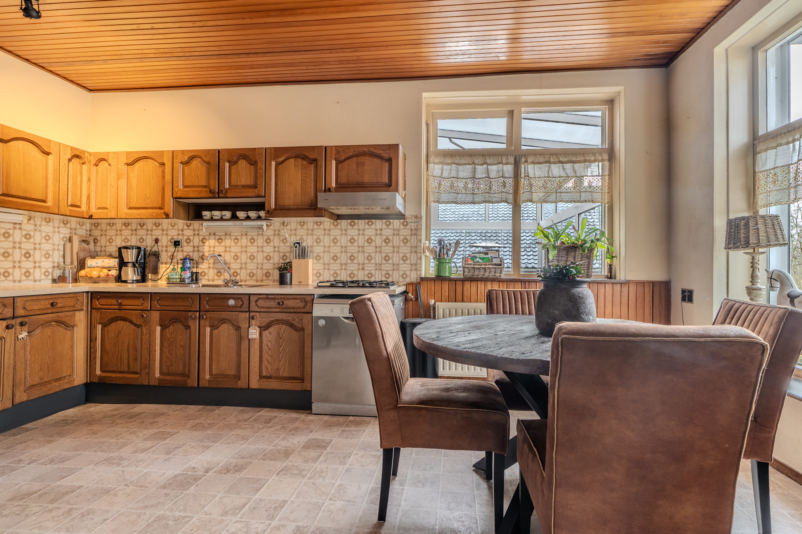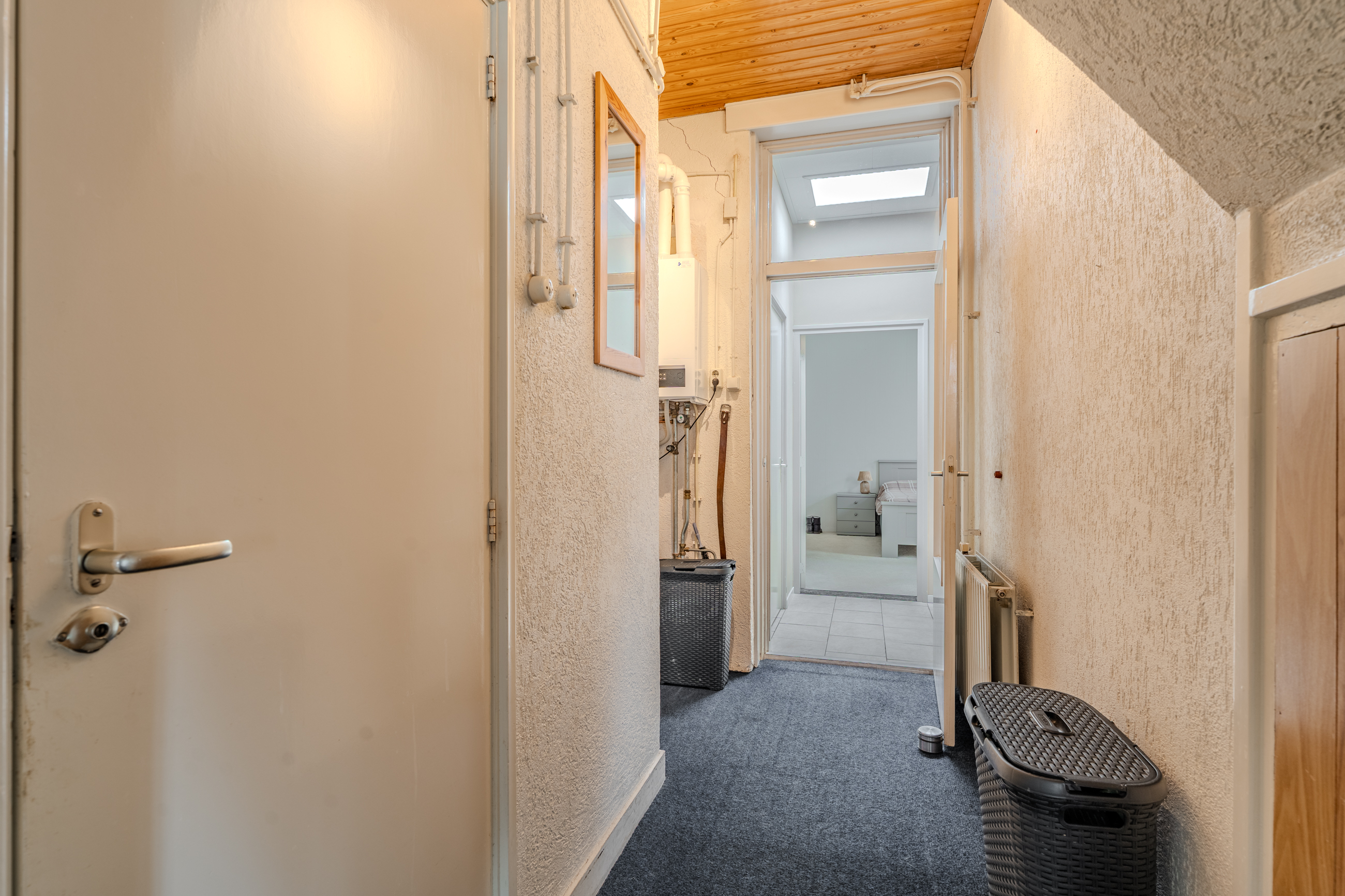 Begane grond: entree/hal met trapopgang – keuken(14,8m²) voorzien van inbouwkeuken met kookplaat, afzuigkap en vaatwasser - woonkamer(31,2m²) – toilet met fontein - bijkeuken(5,6m²) met witgoedaansluiting - badkamer(2,5m²) voorzien van wastafel en douche – hal met achterom – toilet met fontein - slaapkamer(19,4m²) – serre(15,6m²)