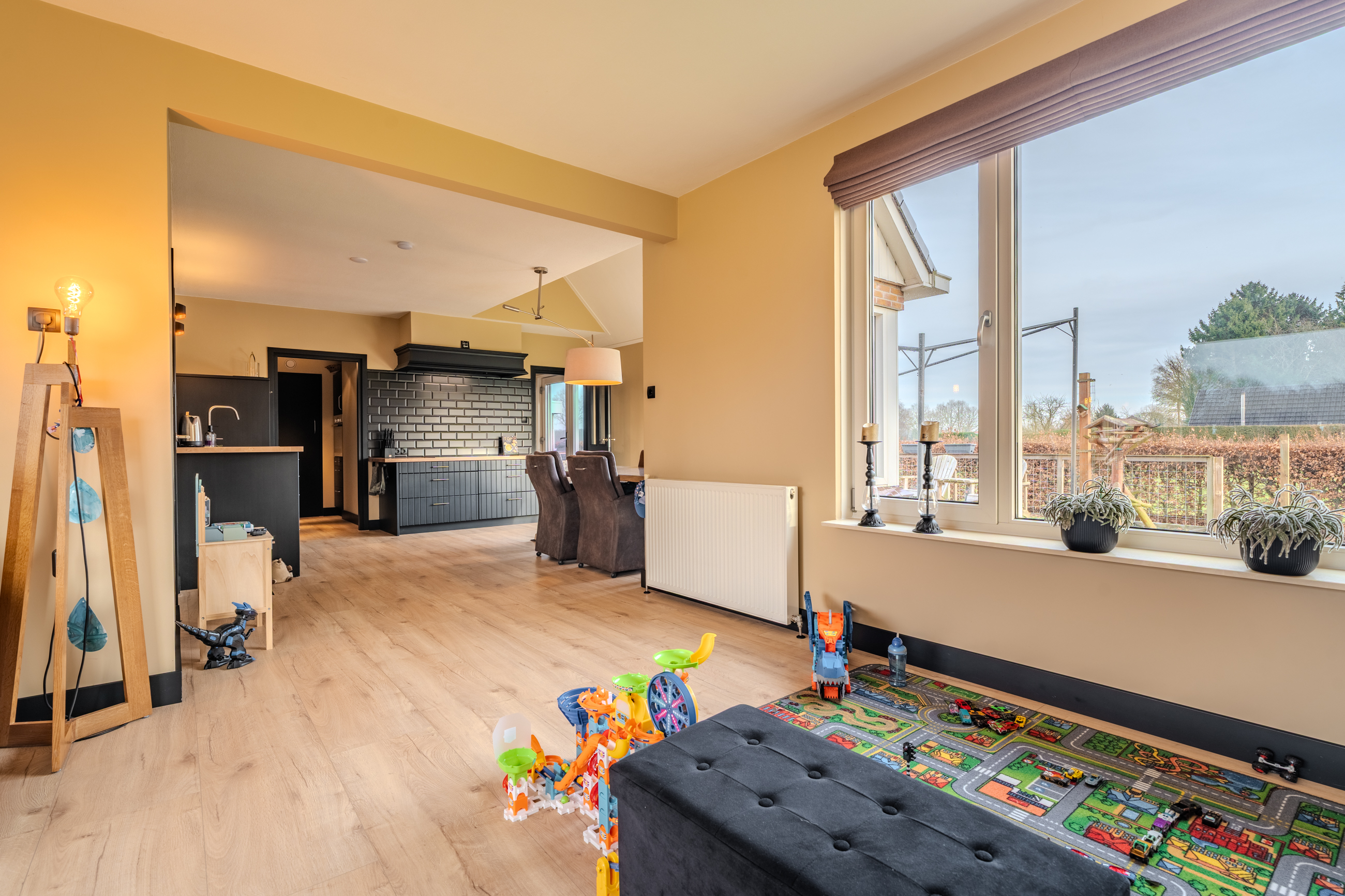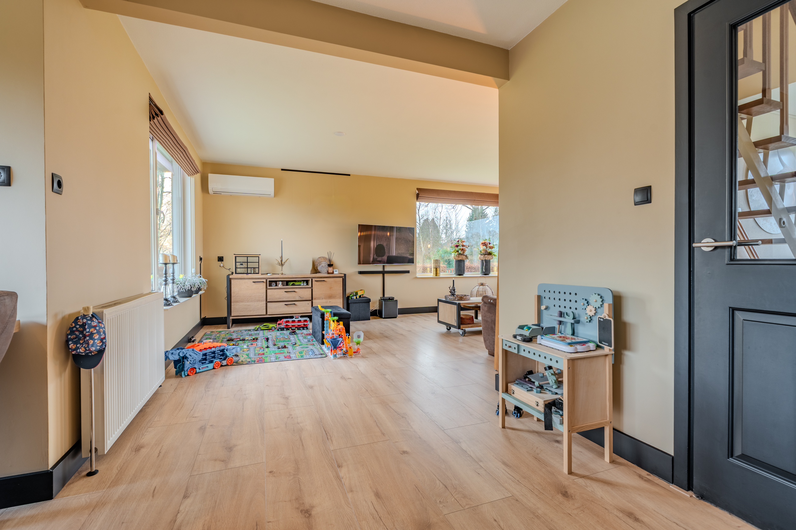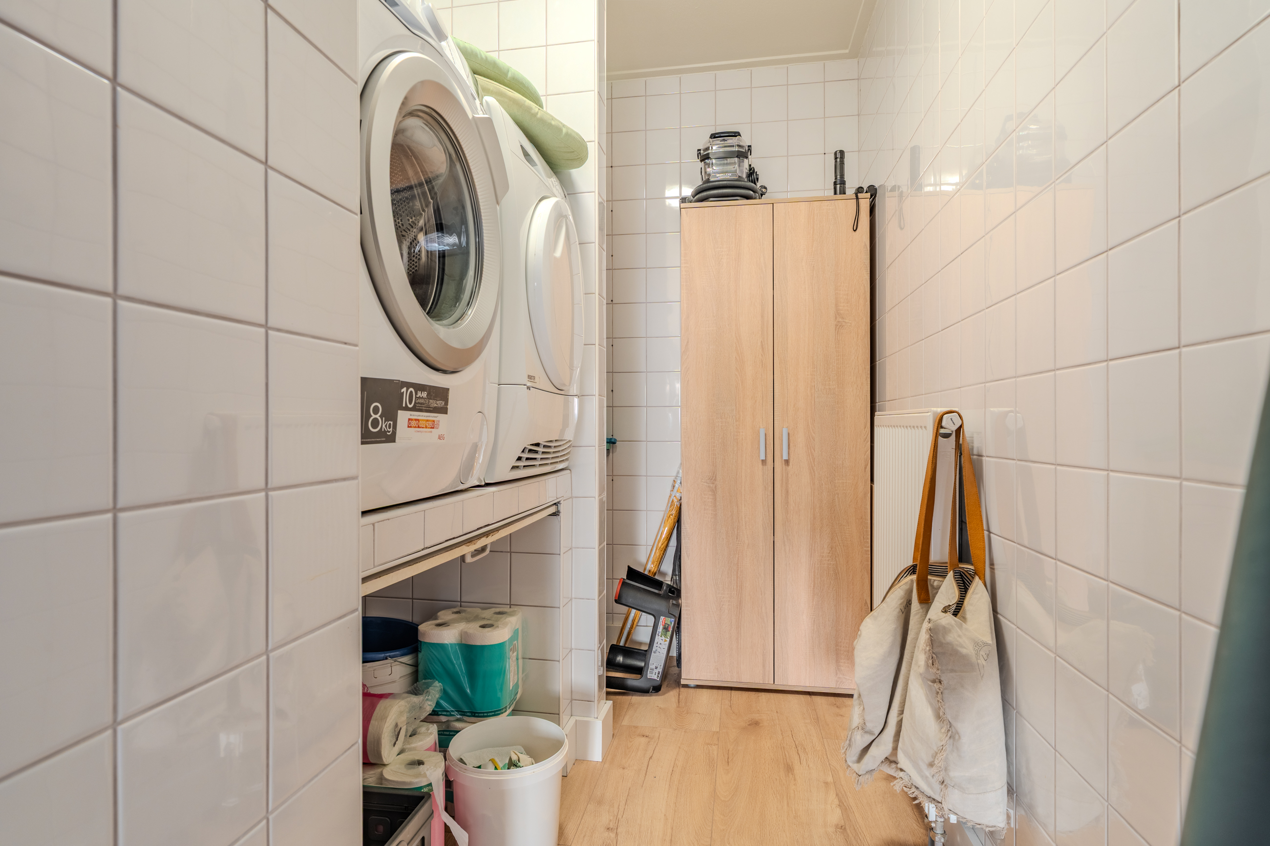 Begane grond: entree/hal met trapopgang - royale woonkamer(53,6m²) met openkeuken voorzien van inductiekookplaat, afzuigunit, oven en vaatwasser – slaapkamer(16,4m²) met inbouwkasten – badkamer met achterom, dubbele wastafelmeubel, inloopdouche en ligbad – hal met achterom – toilet - bijkeuken met witgoedaansluiting.