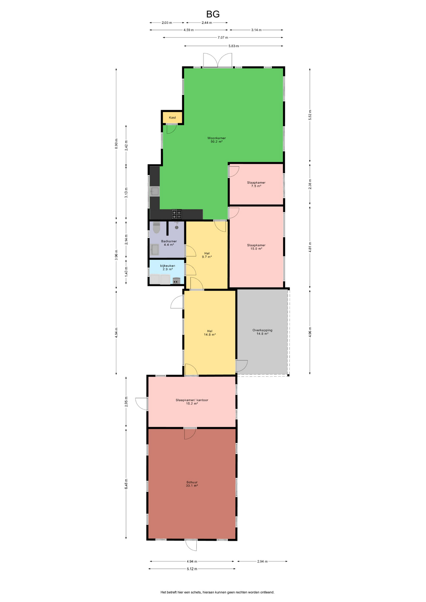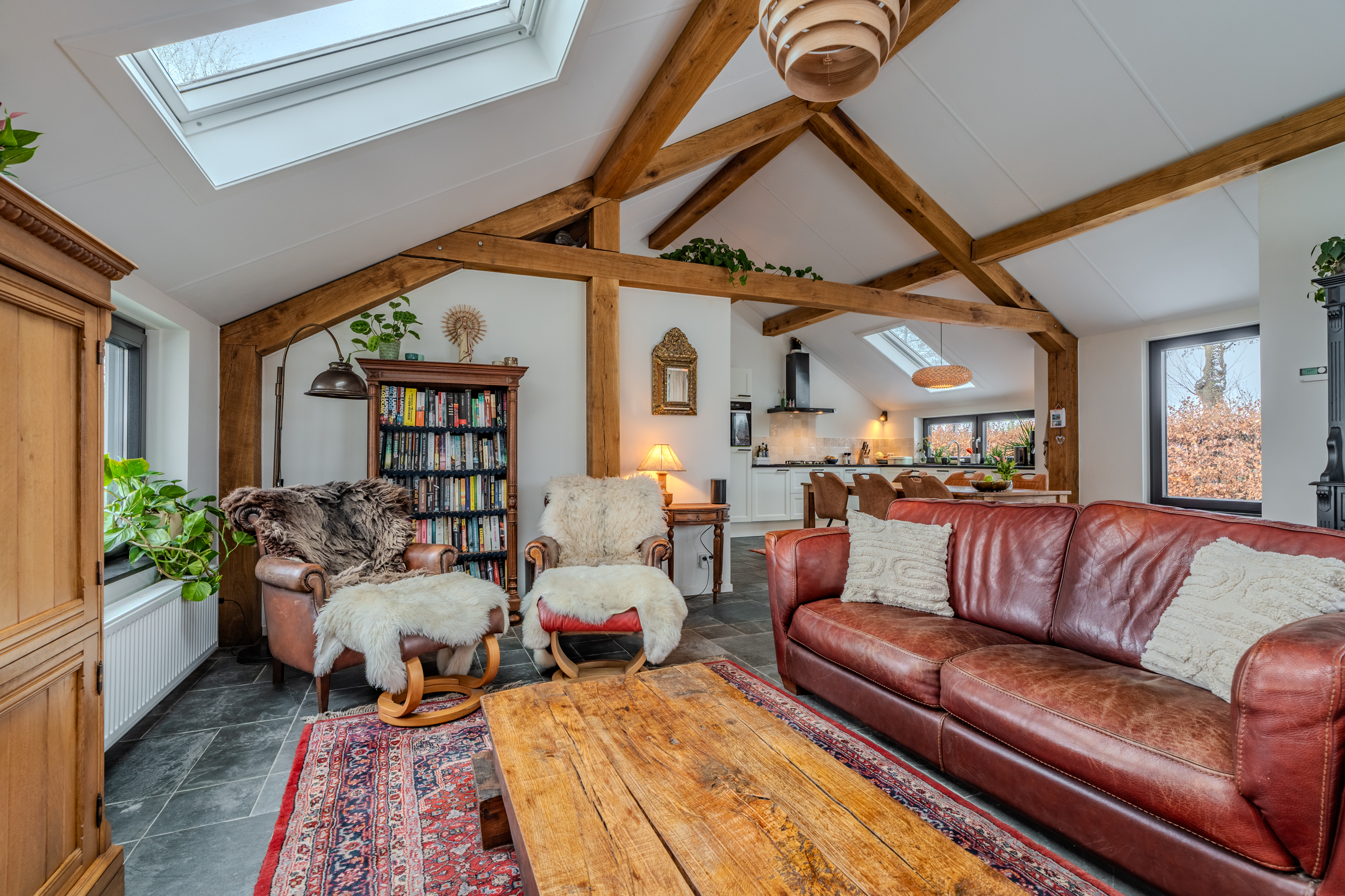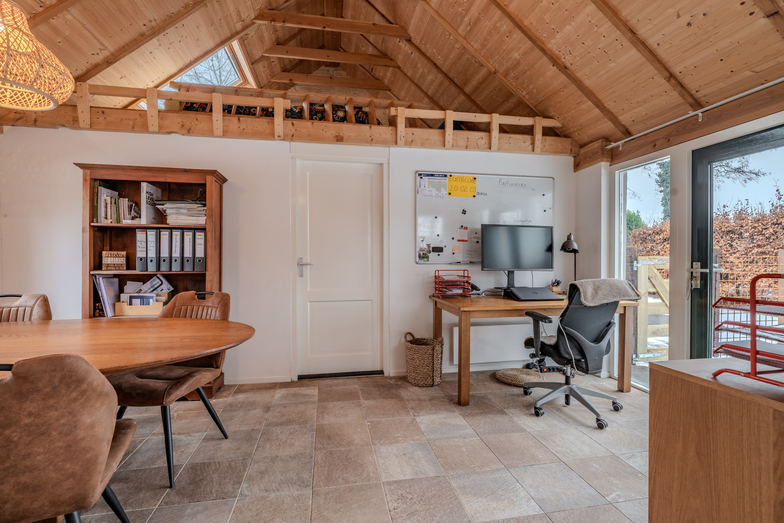Begane grond: entree/hal met achterom naar overkapping – slaapkamer/kantoor(15,2m²) met doorloop naar de schuur, eigen ingang en vide – hal - bijkeuken(2,9m²) met witgoedaansluiting - badkamer(4,4m²) voorzien van wastafelmeubel, inloopdouche en toilet - woonkamer(50,2m²) met openkeuken voorzien van inbouwkeuken met kookplaat, afzuigschouw, oven en vaatwasser - slaapkamer(7,5m²) - slaapkamer(15m²)