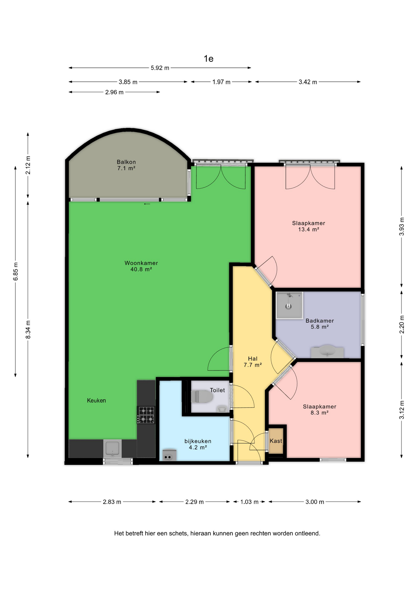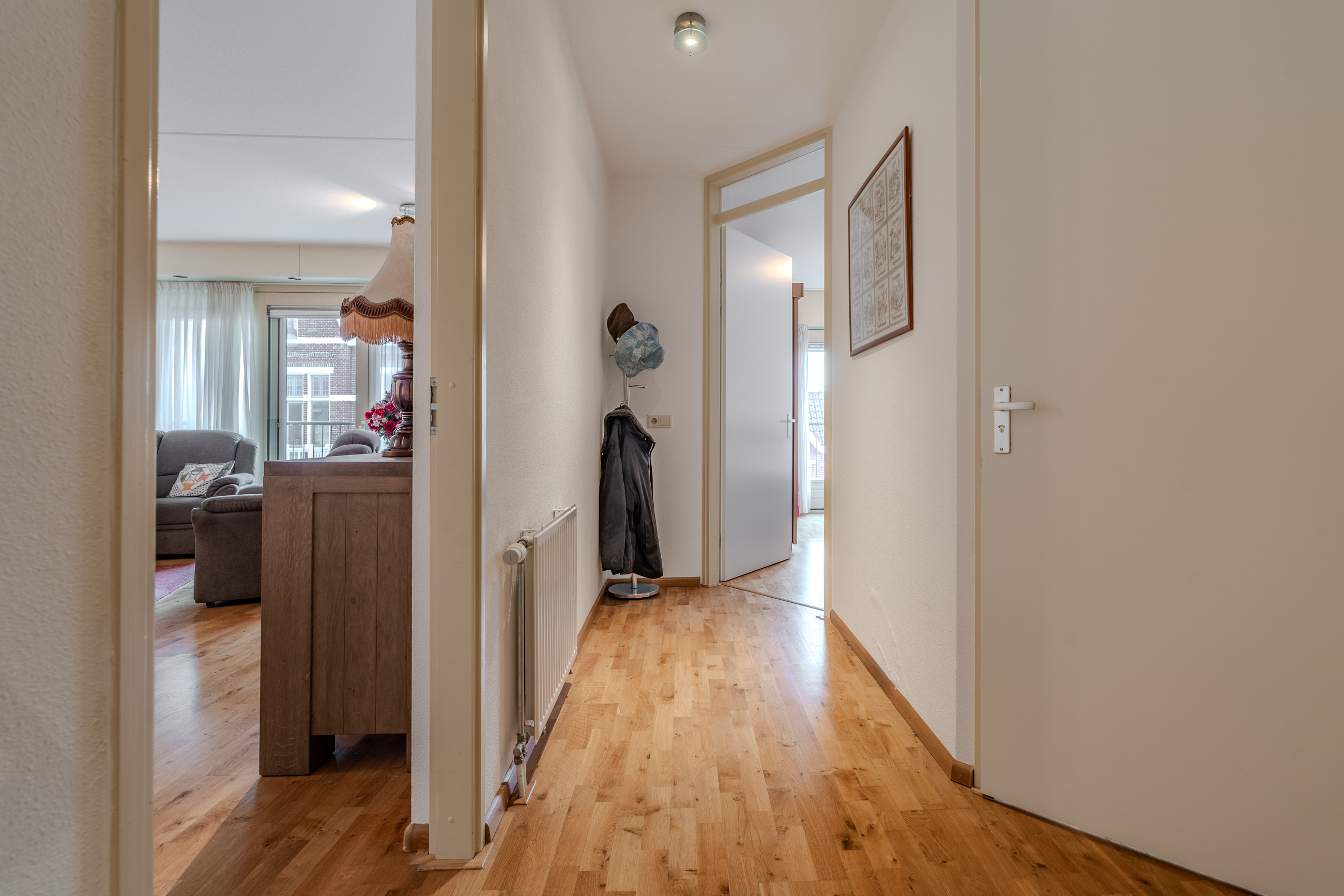 Indeling: entree/hal – bijkeuken(4,2m²) – toilet met fontein - woonkamer(40,8m²) met schuifpui naar balkon en openkeuken met inbouwkeuken voorzien van kookplaat, afzuigschouw, combimagnetron, vaatwasser en koelkast – slaapkamer(13,4m²) - badkamer(5,8m²) voorzien van douche en wastafelmeubel – slaapkamer(8,3m²)