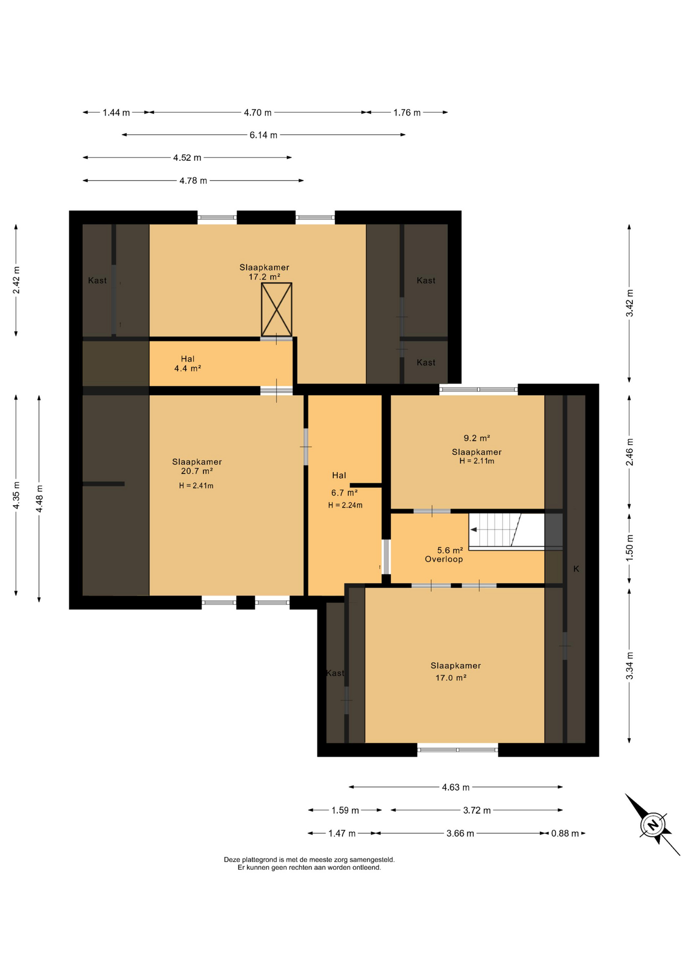 1e verdieping: overloop - slaapkamer(9,2m²) - slaapkamer(17,0m²) – hal - slaapkamer(20,7m²) - hal - slaapkamer(17,2m²)
