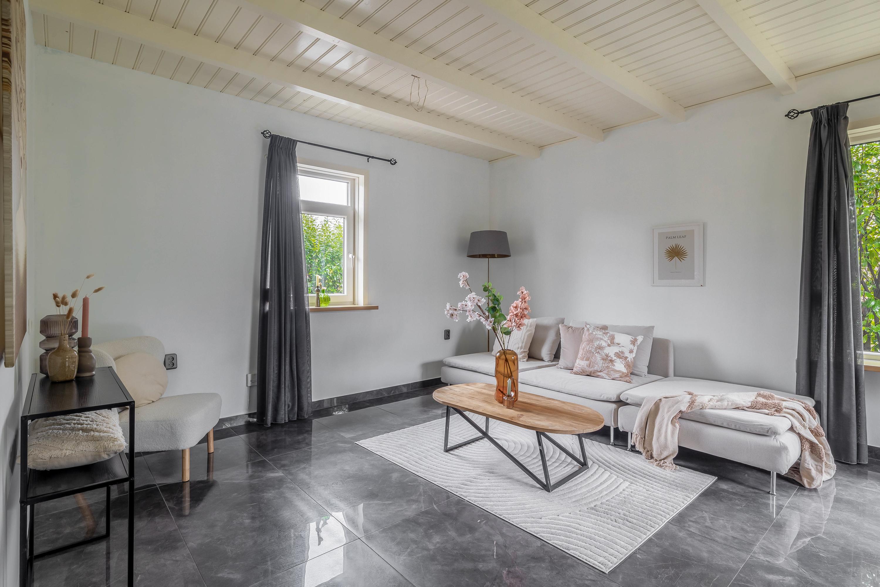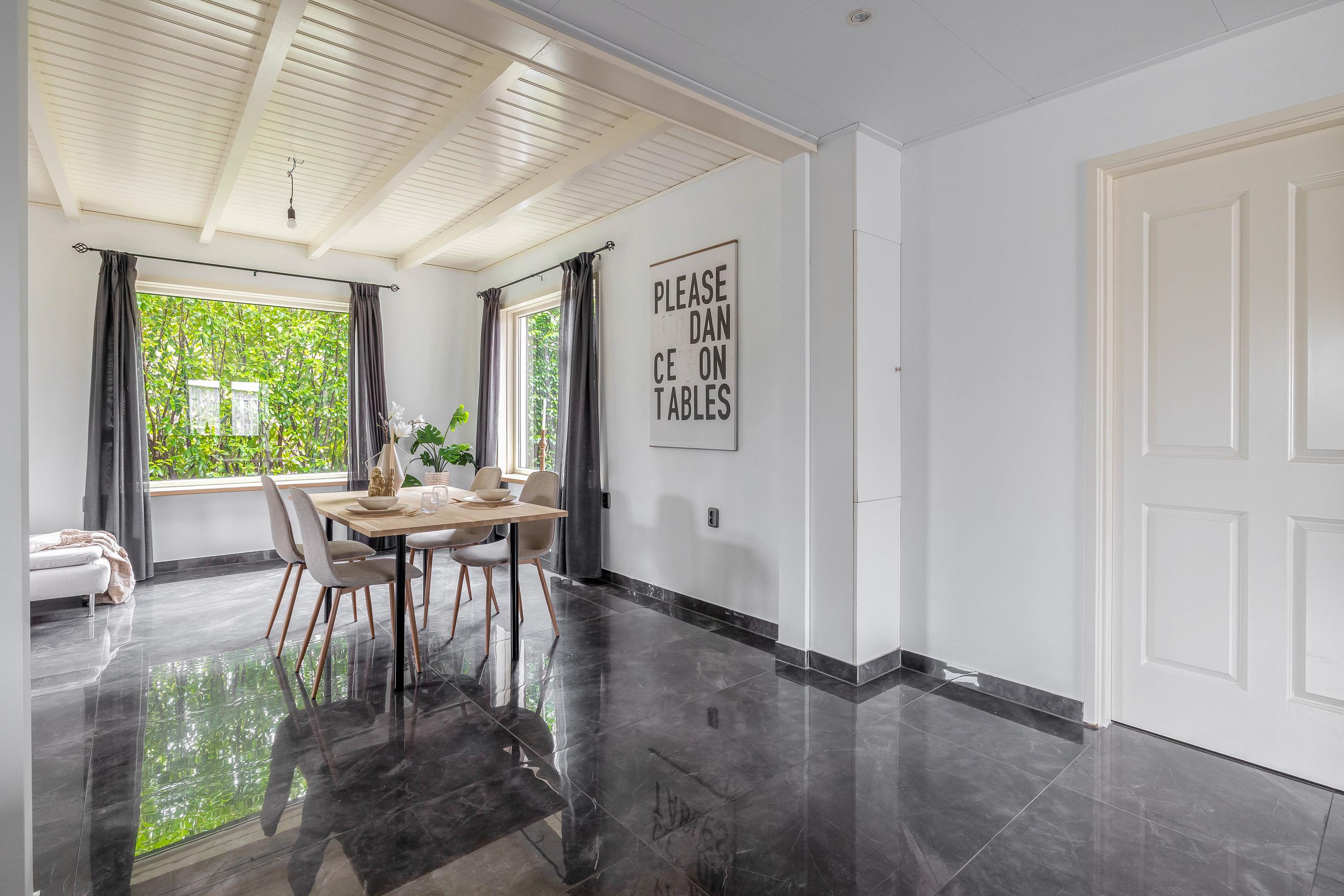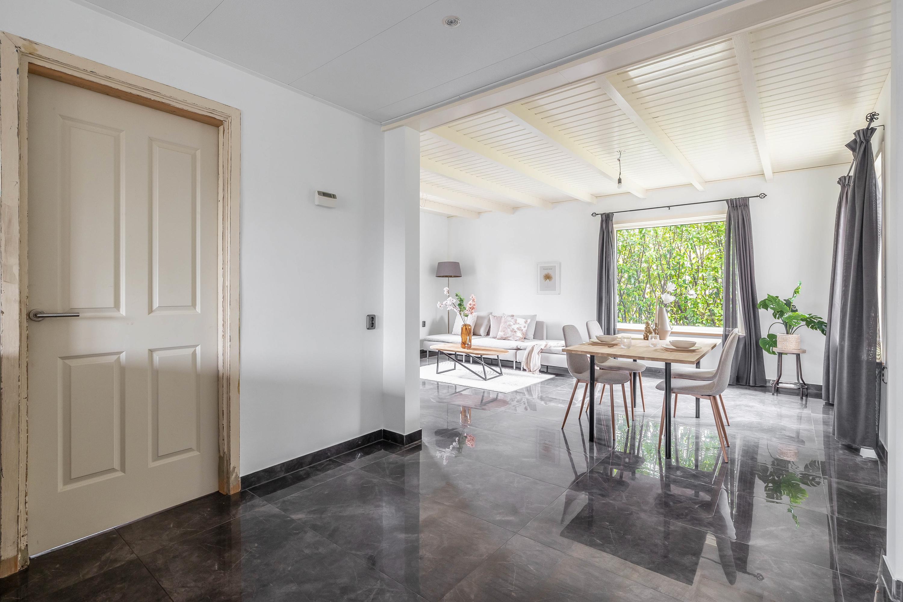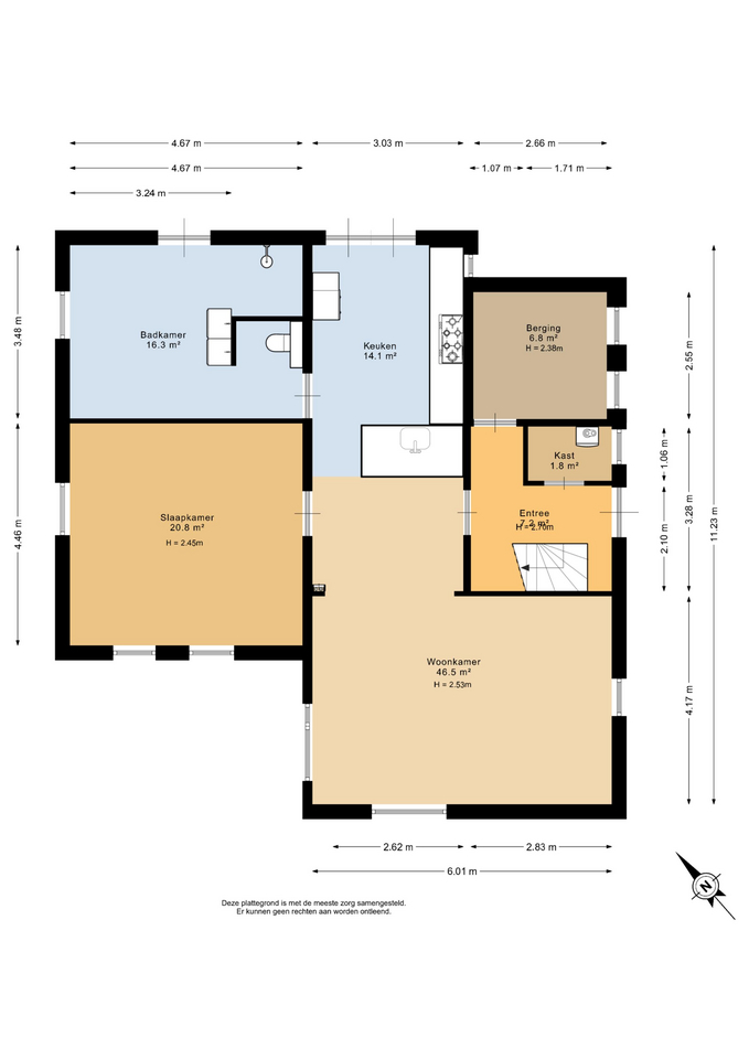 Begane grond: entree/hal – kast – berging(6,8m²) - woonkamer(46,5m²) met openkeuken(14,1m²) met openslaande deuren met inbouwkeuken voorzien van diverse inbouwapparatuur – badkamer(16,3m²) voorzien van dubbel wastafelmeubel, douche, toilet en bubbelbad – slaapkamer(20,8m²)