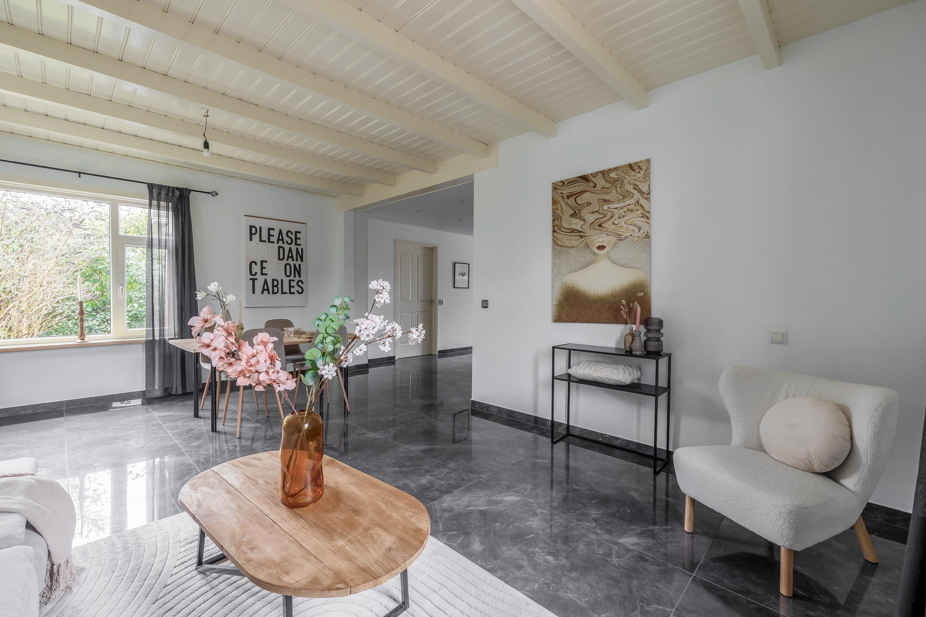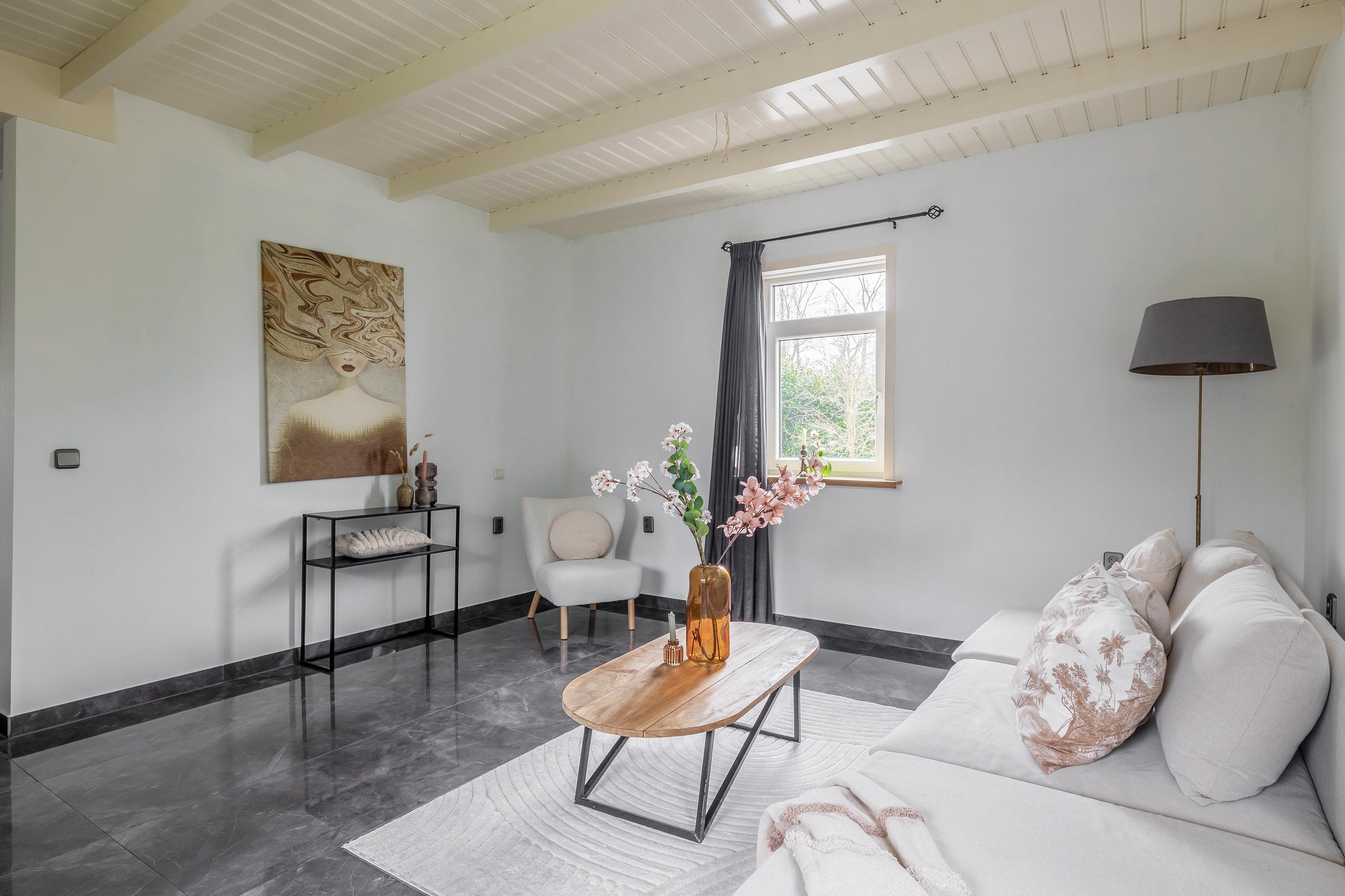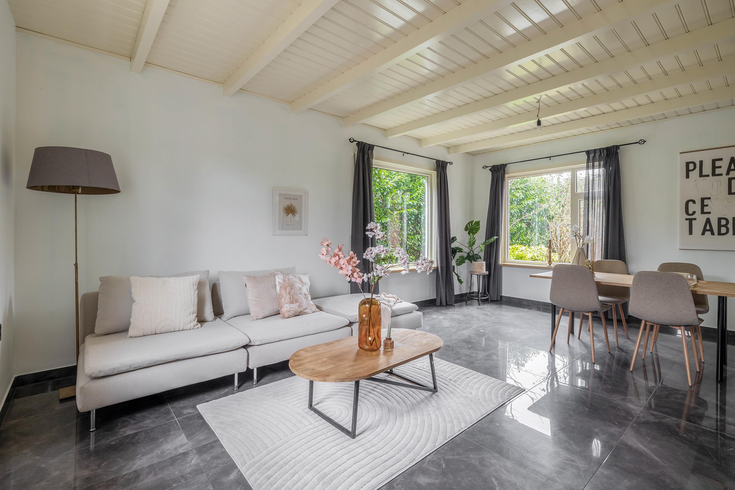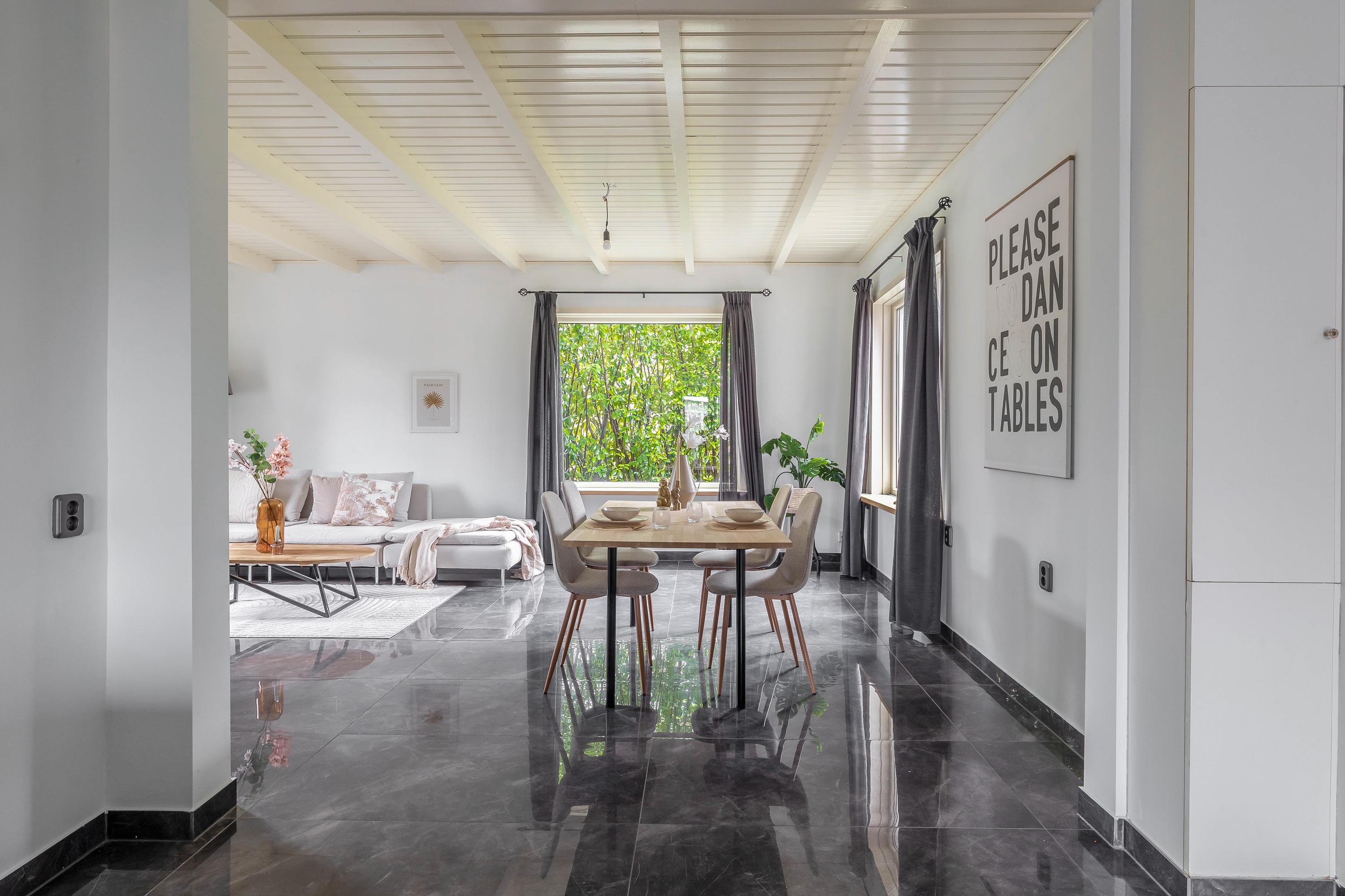 Begane grond: entree/hal – kast – berging(6,8m²) - woonkamer(46,5m²) met openkeuken(14,1m²) met openslaande deuren met inbouwkeuken voorzien van diverse inbouwapparatuur – badkamer(16,3m²) voorzien van dubbel wastafelmeubel, douche, toilet en bubbelbad – slaapkamer(20,8m²)